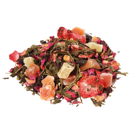 Ingredientes: Té verde China Sencha, papaya, piña, uva pasa, aroma, fresa, pétalos de rosa, frambuesa, bourbon vainilla, cereza.